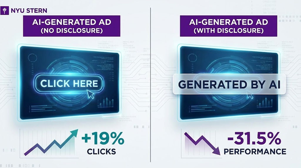 Une étude de la prestigieuse NYU Stern School of Business vient de révéler un paradoxe qui va faire trembler toute l’industrie publicitaire. Les publicités créées entièrement par l’IA augmentent le taux de clics de 19% par rapport aux créations humaines. Mais dès qu’on informe les consommateurs que c’est fait par IA, la performance s’effondre de 31,5%. Bienvenue dans le grand dilemme de la transparence algorithmique.