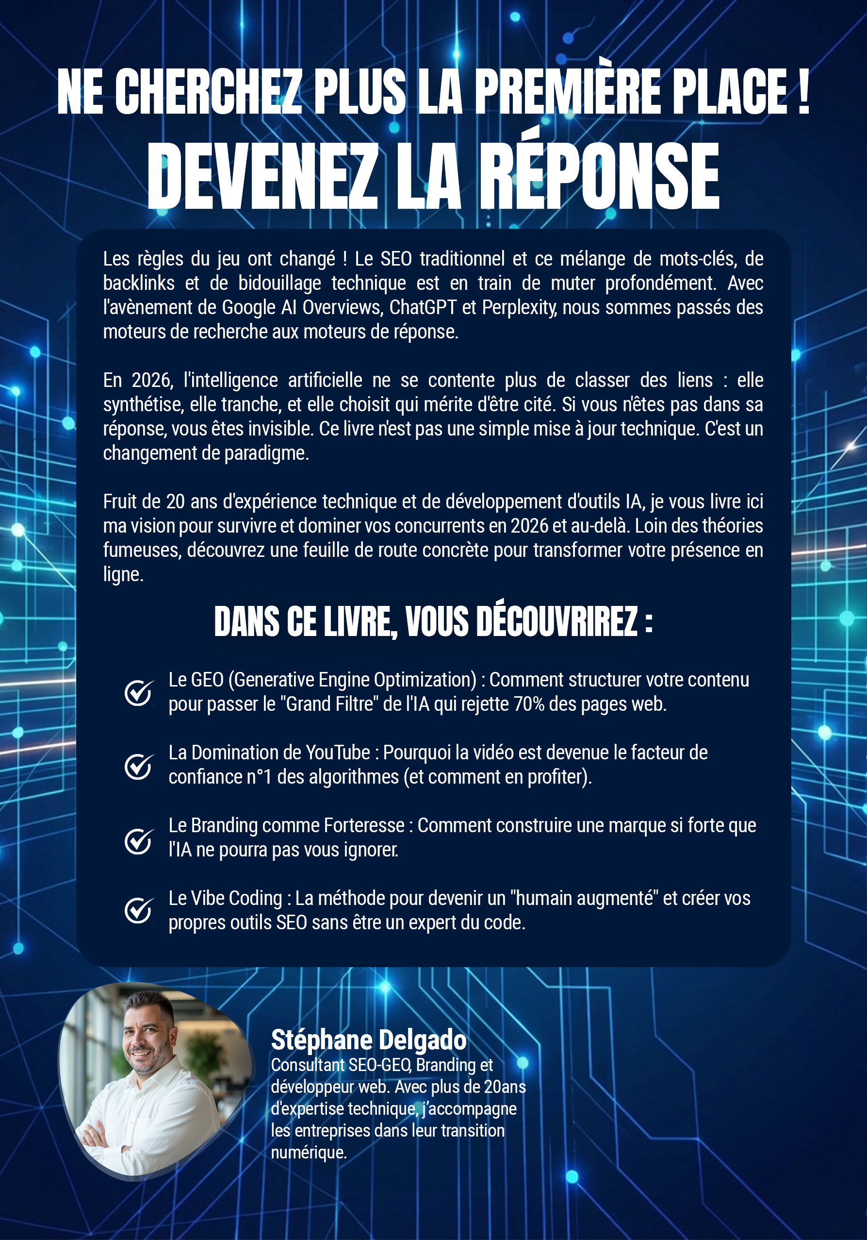 Votre travail SEO actuel a une immense valeur. Ce livre vous montre comment le faire muter naturellement vers le GEO (Generative Engine Optimization). Stéphane Delgado vous propose une méthode positive et constructive pour aligner vos contenus avec les attentes des nouveaux algorithmes génératifs, sans perdre le bénéfice de vos efforts passés.